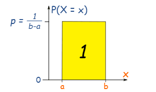 The area of the rectangle is 1 or p × (b−a) = 1. PDF of X following a uniform distribution: